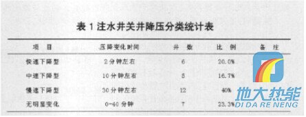 為確定合理降壓時(shí)間,在我隊(duì)30口注水井洗井過(guò)程中觀察注水井壓力隨關(guān)井時(shí)間的變化,以短時(shí)間(60分鐘)壓力出現(xiàn)直線段或相對(duì)直線段統(tǒng)計(jì),歸納總結(jié)如表1所示的幾種類(lèi)型:快速下降型、中速下降型、慢速下降型、無(wú)明顯變化型。 根據(jù)調(diào)查統(tǒng)計(jì)結(jié)果,來(lái)確定不同類(lèi)型的關(guān)井降壓時(shí)間:快速下降型的井只需關(guān)井3 ̄5分鐘;中速下降型的注水井需關(guān)井10 ̄15分鐘;慢速下降型的注水井需關(guān)井降壓30分鐘,無(wú)明顯變化型的注水井可直接洗井(洗井時(shí)應(yīng)觀察壓降的變化)。為此關(guān)井降壓的最佳時(shí)間應(yīng)該是壓降變化趨于穩(wěn)定的時(shí)間,較為合理。