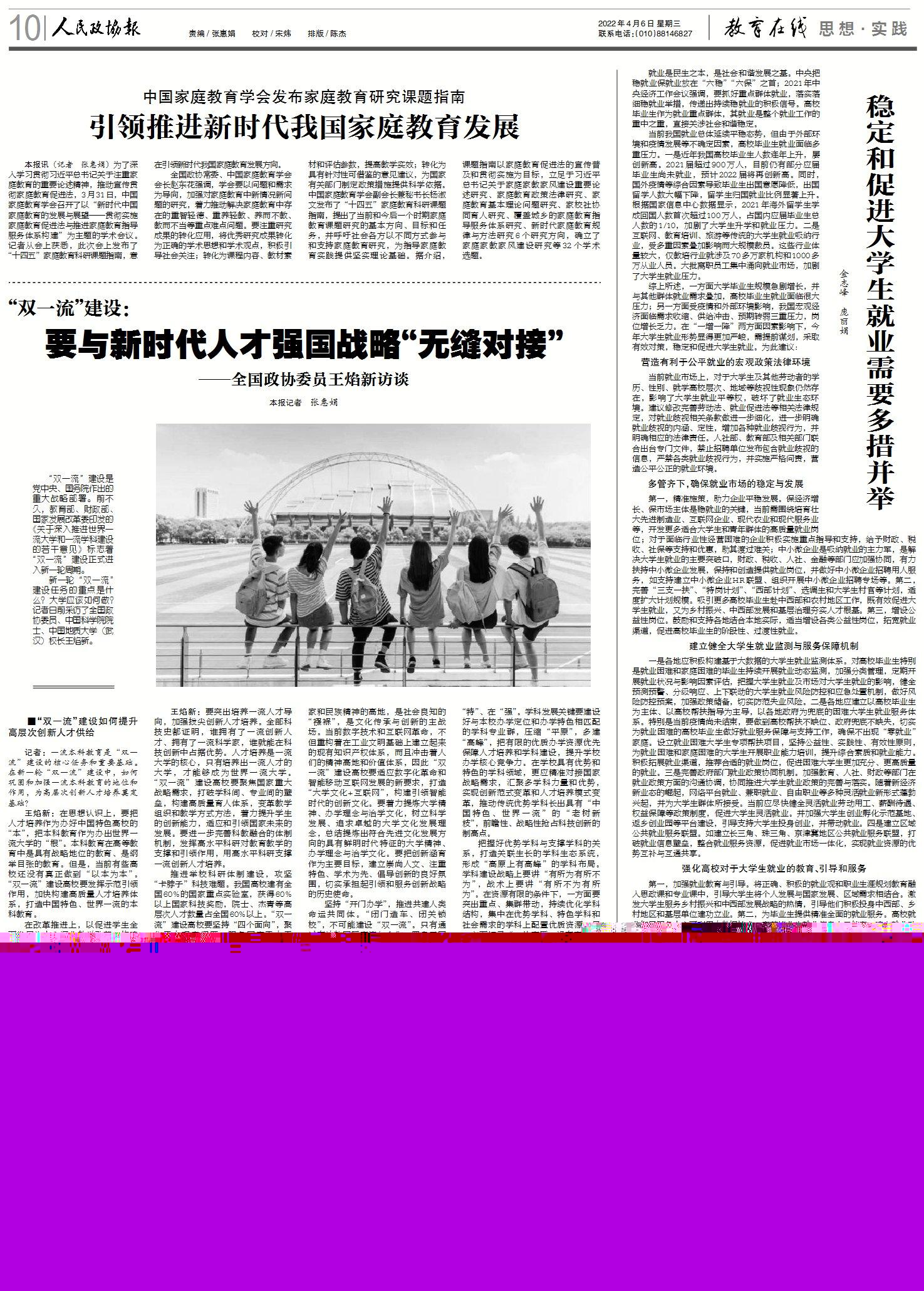 王焰新:在思想認識上,要把人才培養(yǎng)作為辦好中國特色高校的“本”,把本科教育作為辦出世界一流大學(xué)的“根”。本科教育在高等教育中是具有戰(zhàn)略地位的教育、是綱舉目張的教育。但是,當(dāng)前有些高校還沒有真正做到“以本為本”?!半p一流”建設(shè)高校要發(fā)揮示范引領(lǐng)作用,加快構(gòu)建高質(zhì)量人才培養(yǎng)體系,打造中國特色、世界一流的本科教育。