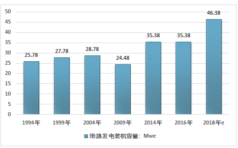 截止2018年年底,中國地區(qū)地?zé)岚l(fā)電累計(jì)裝機(jī)約46.38MWe。