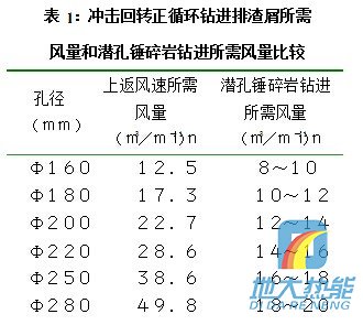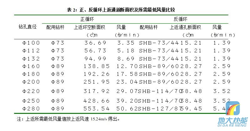 基巖水井通常口徑為Φ160~Φ280mm之間,該口徑硬巖的鉆進(jìn)效率低,成本高,施工周期長(zhǎng),成為鉆探界亟待解決的難題。20世紀(jì)70年代開(kāi)始,我國(guó)已引進(jìn)潛孔錘技術(shù)應(yīng)用于水井鉆鑿,鉆進(jìn)效率數(shù)倍提高,展示了潛孔錘鉆進(jìn)的良好前景。但水井工程,孔深大,背壓高,配套使用的空壓機(jī)不但風(fēng)量要求大,風(fēng)太也高,使鉆進(jìn)成本大幅度增高。主要矛盾是滿(mǎn)足排渣屑上返風(fēng)速的要求時(shí),供風(fēng)量巨大,遠(yuǎn)超過(guò)了潛孔錘本身工作的需求。計(jì)算不同孔徑條件下滿(mǎn)足上返風(fēng)速15m/s供風(fēng)量的需求,見(jiàn)表1(Φ89鉆桿為例)。表1數(shù)據(jù)表明,孔徑越大,為滿(mǎn)足排渣屑要求而消耗的能量越大,經(jīng)濟(jì)性越差。若實(shí)施反循環(huán)鉆井技術(shù)工藝,則排渣屑所需風(fēng)量大大減小,如表2所示。