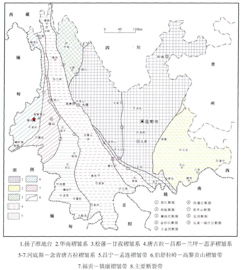 圖1 云南騰沖縣地理位置圖 2.項(xiàng)目區(qū)地質(zhì)背景 騰沖縣位于高黎貢山西側(cè),總體地勢(shì)北高南低,山脈走向?yàn)楸睎|一西向及南北向,與區(qū)域構(gòu)造線基本一致。高黎貢山與怒江并列向南蜿誕,高黎貢山峰脊一線海拔多在3000m以上;而怒江河谷海拔僅500—900m,區(qū)內(nèi)最高峰為高黎貢山中段的大腦子,海拔3780.9m;最低點(diǎn)為盈江縣拉沙河與穆雷江交匯處,海拔僅210m;最大高差達(dá)3570.9m,一般高差在400—2000m之間,屬中高山中一深切割地區(qū)。縣城西側(cè)為高中山地貌景觀,谷深坡陸;東側(cè)為中山山地稍為平緩,但切割密度較大;中部為斷陷谷地,河流階地發(fā)育,地勢(shì)平坦開(kāi)闊。騰沖地區(qū)構(gòu)造運(yùn)動(dòng)活躍、斷裂構(gòu)造發(fā)育、巖漿活動(dòng)頻繁、火成巖分布廣泛、新生代火山活動(dòng)、現(xiàn)代水熱活動(dòng)異常強(qiáng)烈,溫沸泉眾多。
